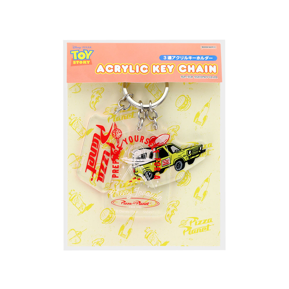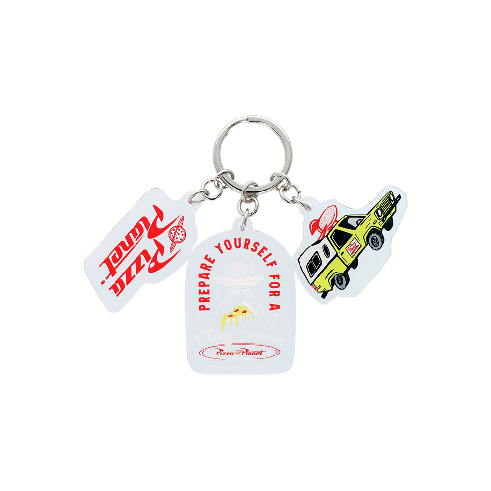 「ピザ・プラネット」のポップなアートを取り入れたアクリルキーホルダー。