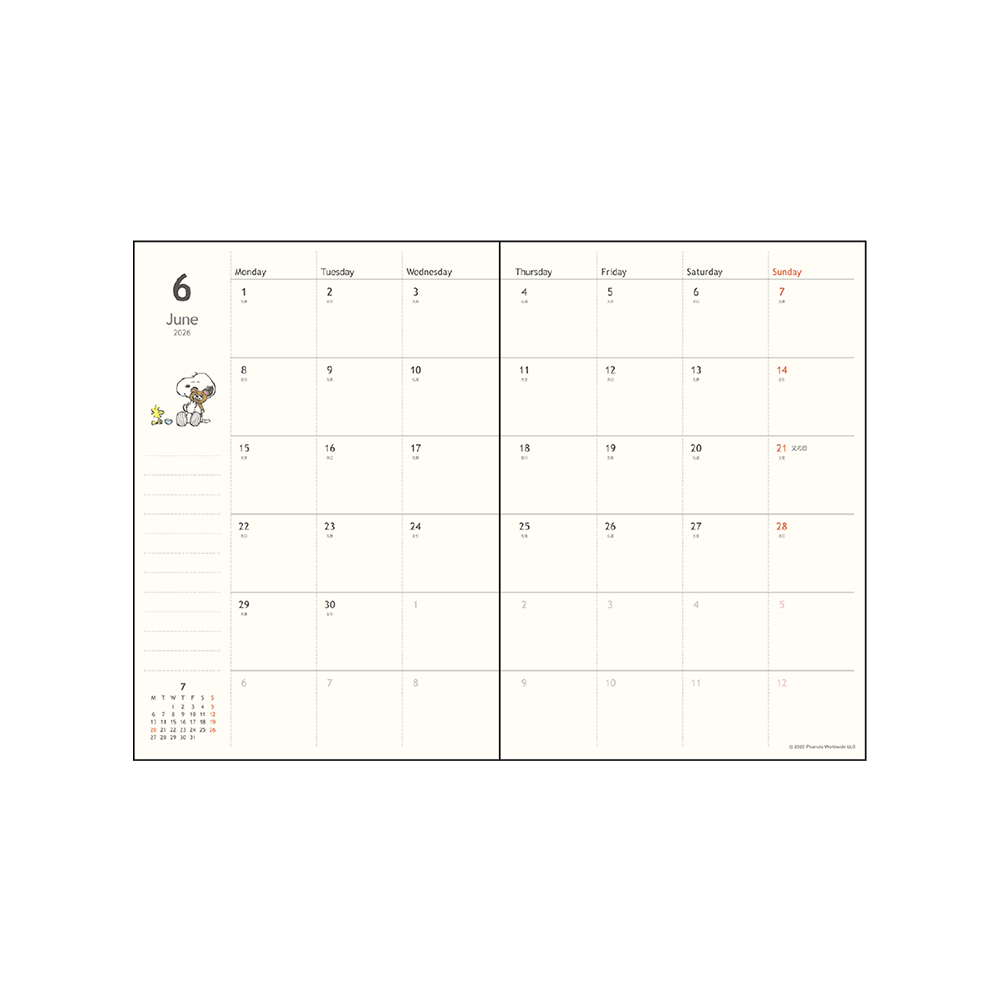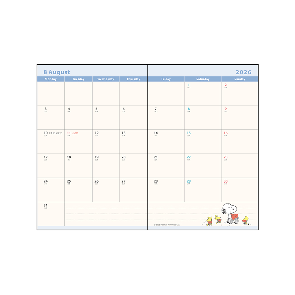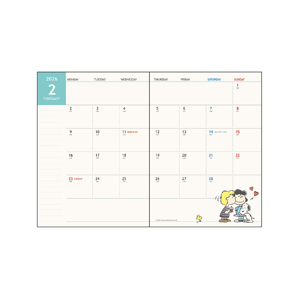 本文は月ごとに見開きで予定を確認でき、「スヌーピー」たちのカラーイラストが添えられています。