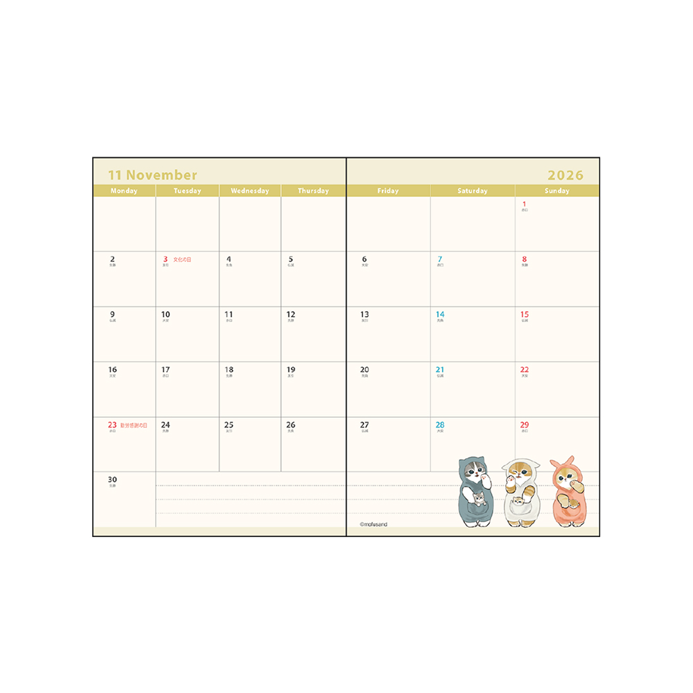 そんな「mofusand」に登場するにゃんこたちを描いた2026年版スケジュールブックがサンスター文具から登場。