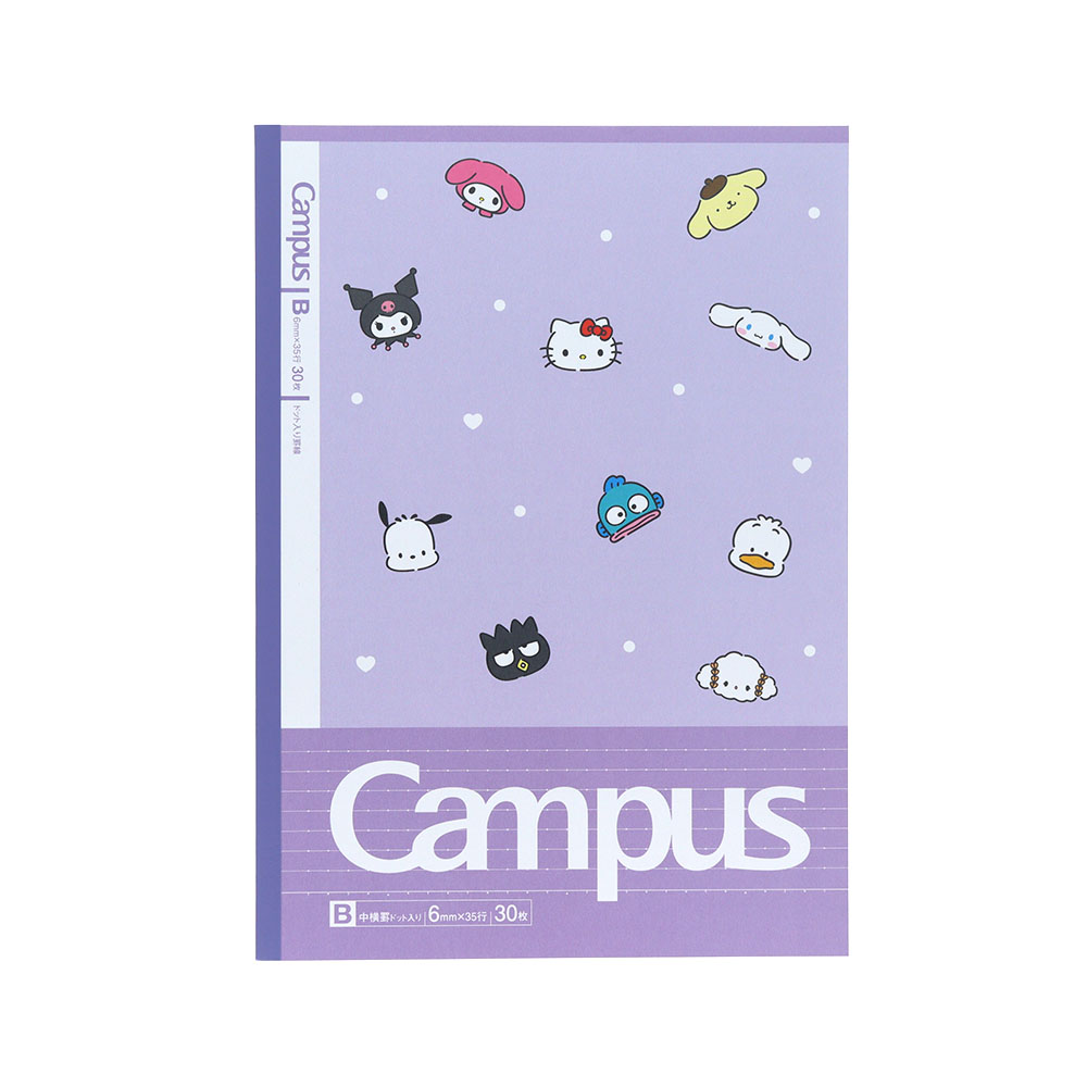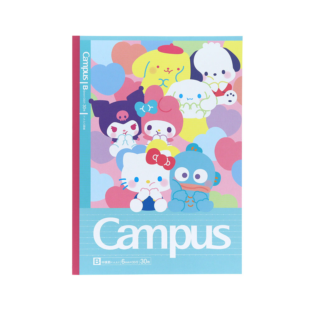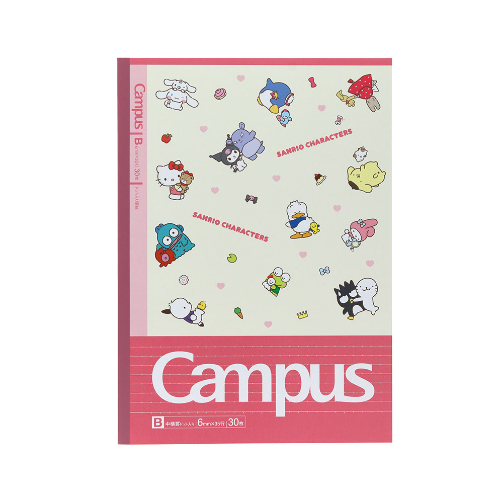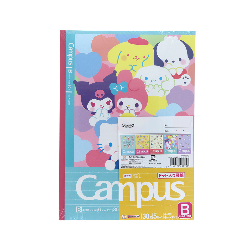 ドットの入った罫線が便利なキャンパスノートドットの5冊パックに、「サンリオキャラクターズ」があしらわれたデザインが登場。