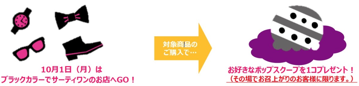 サーティワンの店舗へ黒色の何かを持参、または身につけてお店に行き、対象商品を購入すると、アイスクリーム(ポップスクープ)を1コもらうことができます♪