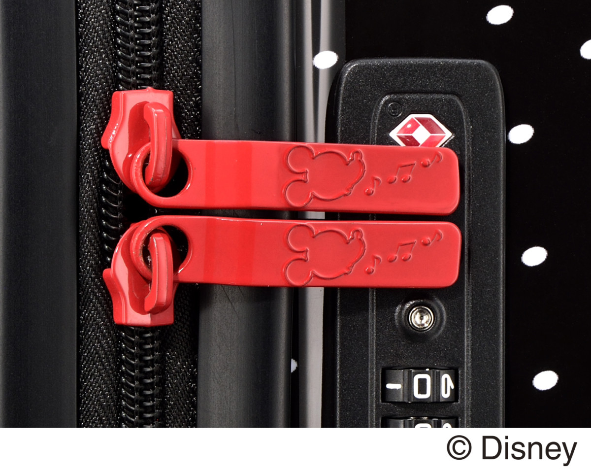 スーツケースのボディ左下には、タキシード姿でシルクハットを手にしたキュートなミッキーマウスの姿を描いたエンブレムが!