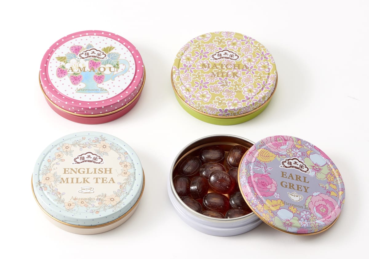 榮太樓總本鋪の創業200周年を記念して、Afternoon Teaのアーカイブ柄の限定デザインでイングリッシュミルクティー、アールグレイ、抹茶ミルク、あまおう、4種類のキャンディーが登場です☆