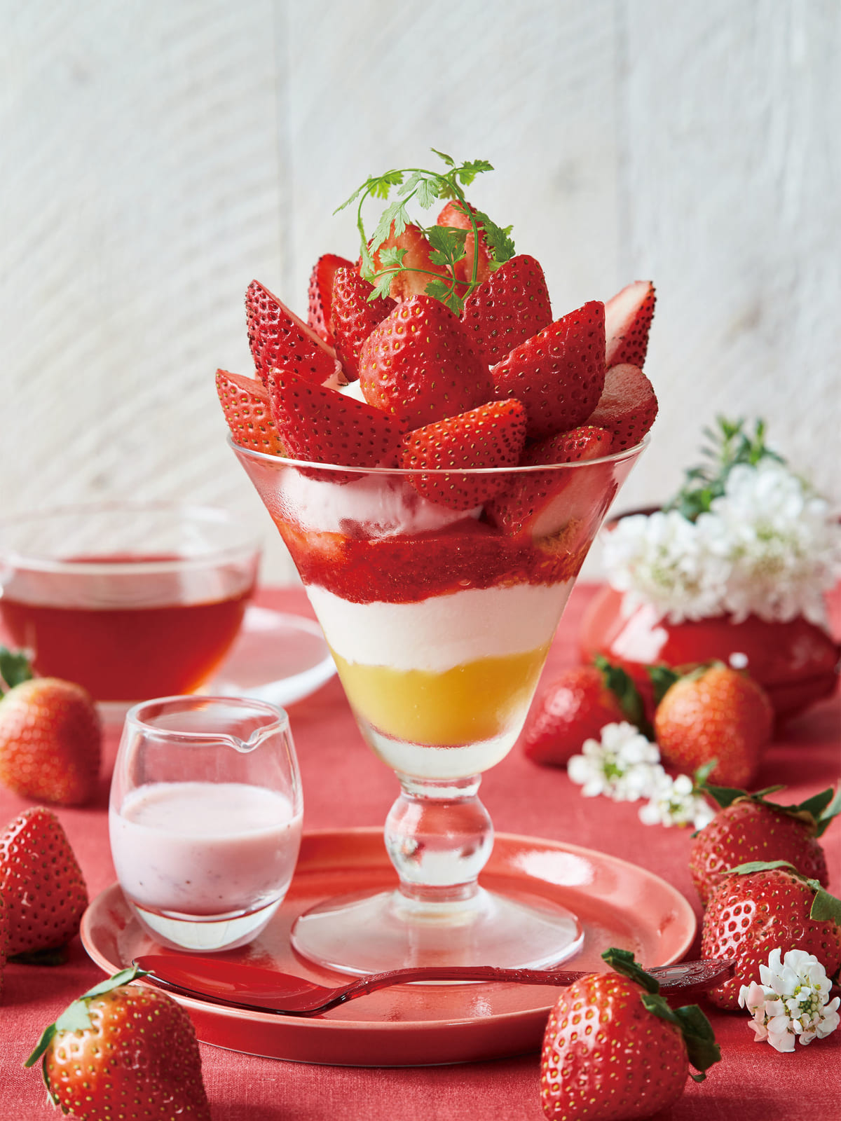 たっぷりの苺とふわっとした口溶けのマスカルポーネのホイップ、カモミール風味の爽やかなオレンジソースを合わせた春らしいパフェ。
