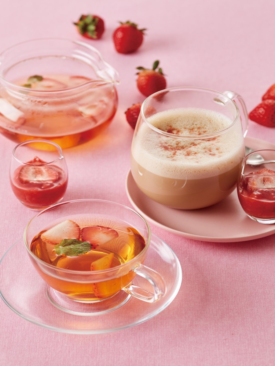 写真左のフレッシュストロベリーティーは、フレッシュな苺を浮かべた「ストロベリーダージリン ファーストフラッシュブレンド」が香りを引き立てています。