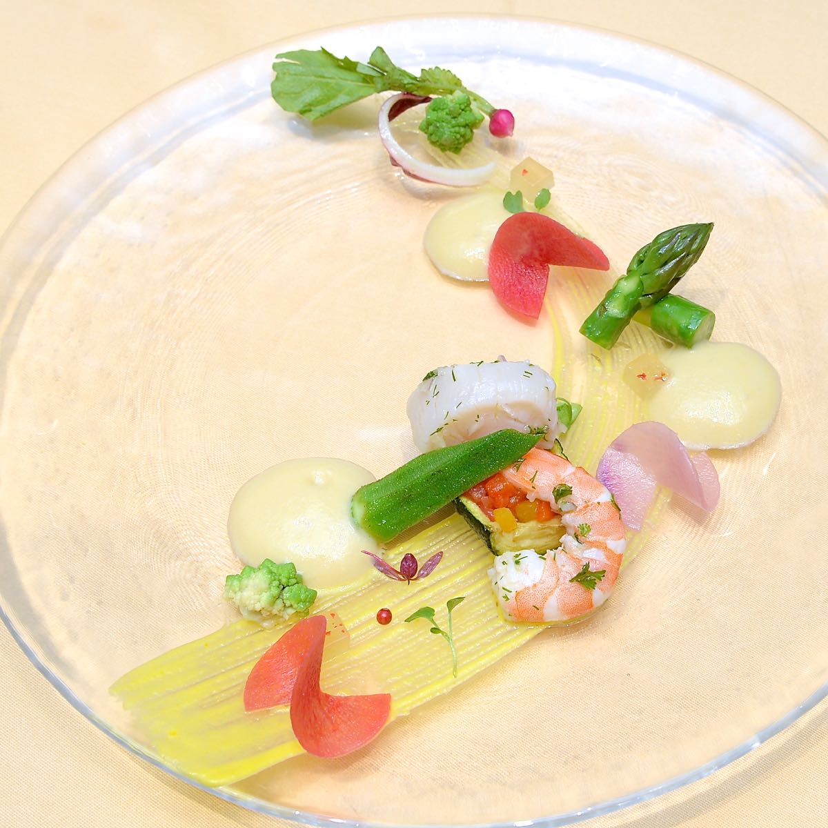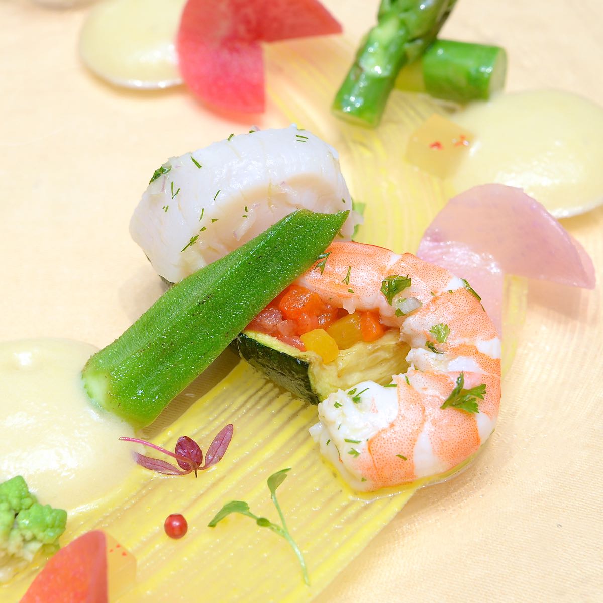 • 天使の海老と帆立貝のハーブマリネ バーニャフレッダのエスプーマ