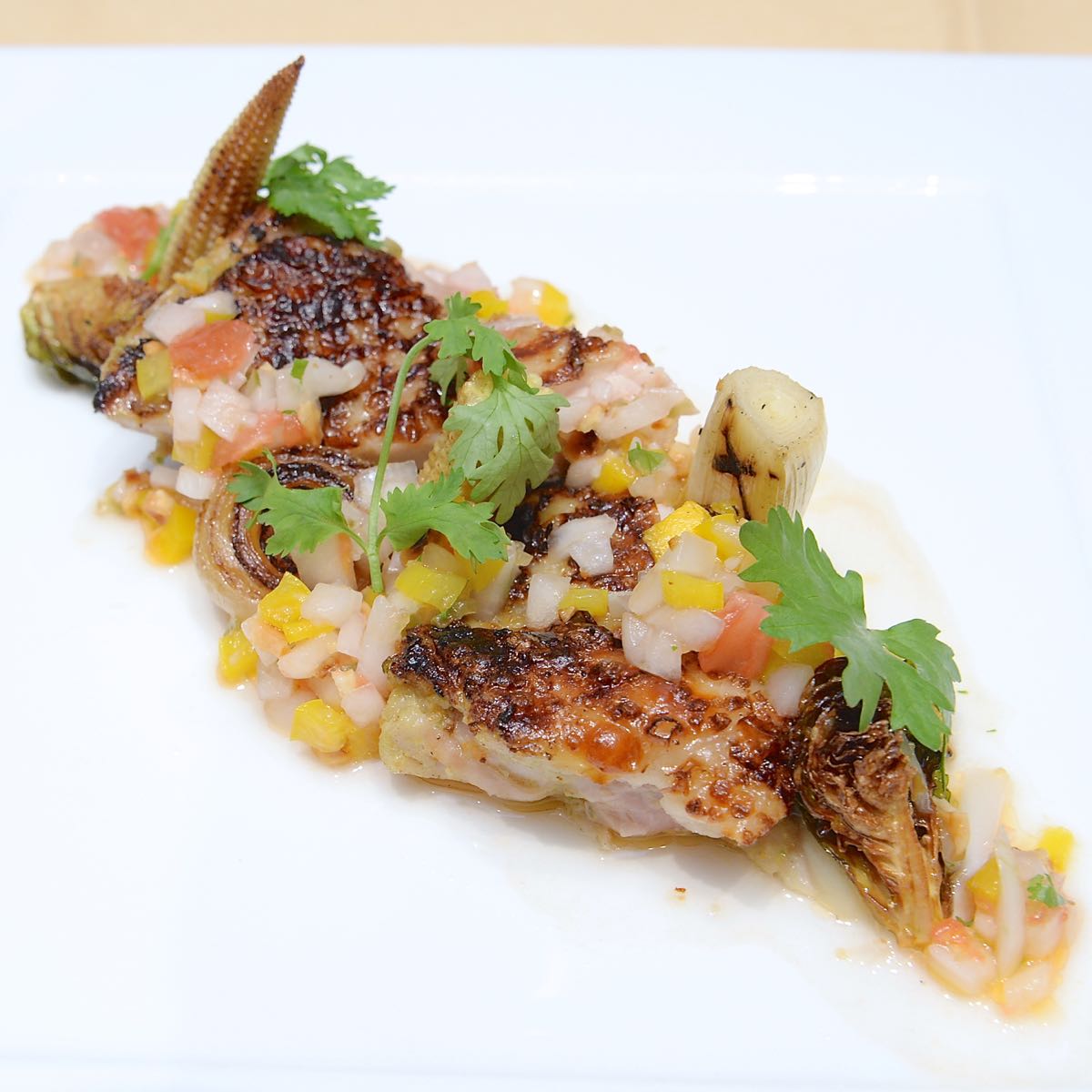 香味野菜でマリネした鶏モモ肉のグリル トマトとナッツのサルサ