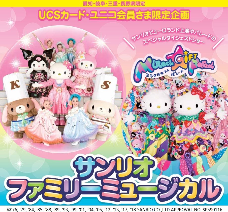 2018年5月14日(月)より、愛知・岐阜・三重・長野県下のアピタ・ピアゴ125店舗全店にて、応募期間中にUCSカード、またはユニコでの全額払いのカード会員を対象に、サンリオファミリーミュージカルが抽選であたる企画開催!