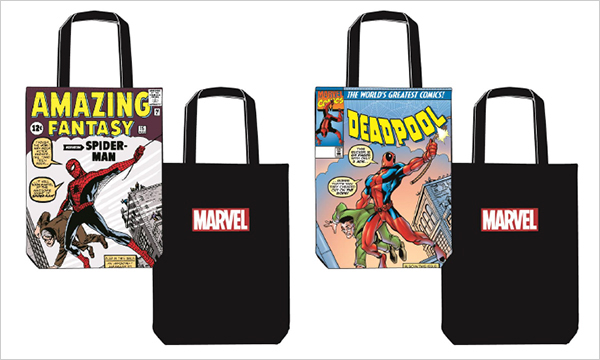 「トートバッグ(左:スパイダーマン/右:デッドプール)2,500円」など、限定アイテムを用意。