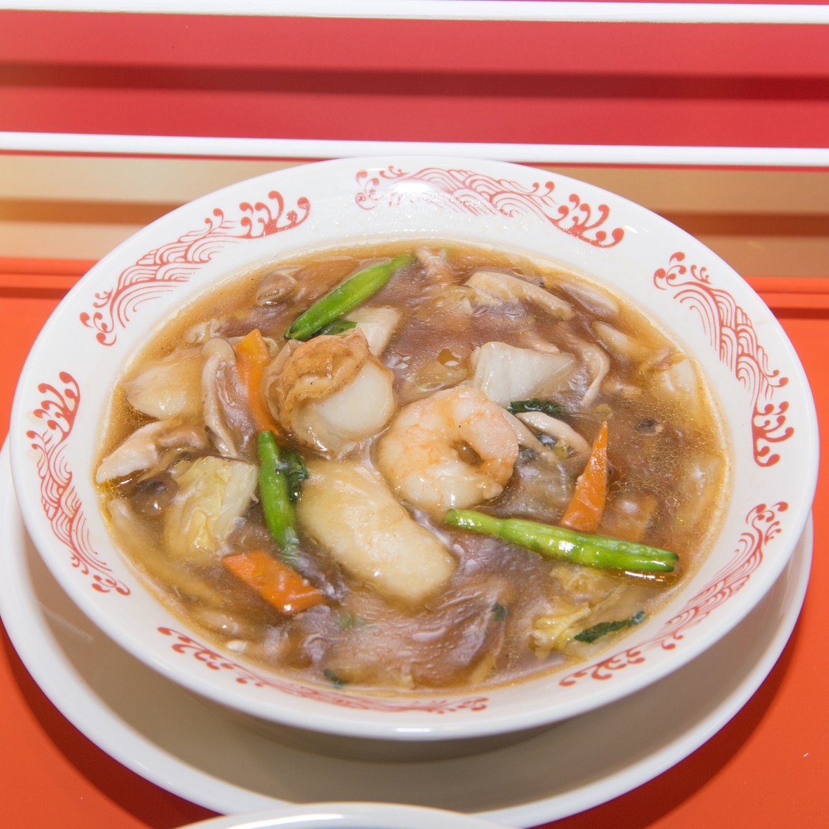 プリプリの海老、ホタテとイカという人気の海鮮3種をメインに、ふんだんに具が入ったあんかけ麺。