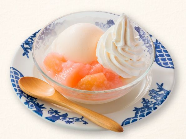 ひんやり、とろーりの口当たりがたまらないとろとろ白桃とアンニンのアイス添えと、ももいろクローバーミヤンオリジナル小皿1枚のセットです。