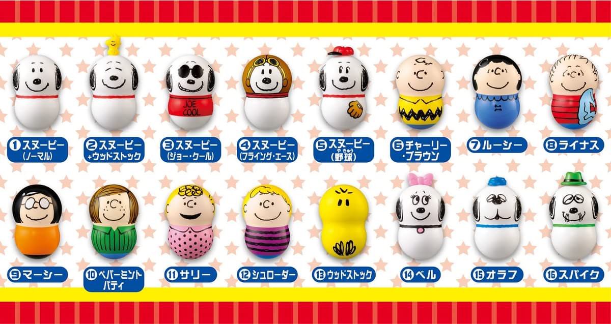 ラインナップ:全16種 1.スヌーピー(ノーマル) 、2.スヌーピー+ウッドストック、3.スヌーピー(ジョー・クール)、4.スヌーピー(フライング・エース)、5.スヌーピー(野球)、6.チャーリー・ブラウン、7.ルーシー、8.ライナス、9.マーシー、10.ペパーミント パティ、11.サリー、12.シュローダー、13.ウッドストック、14.ベル、15.オラフ、16.スパイク