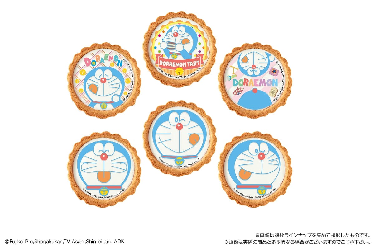 レアチーズ味のタルトにドラえもんの顔がデザインされたフィルムを組み合わせ6種類のお茶目なパッケージが楽しめます。