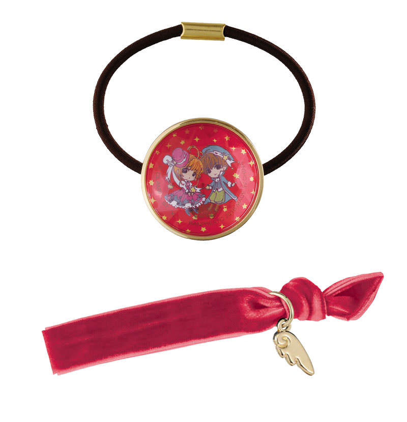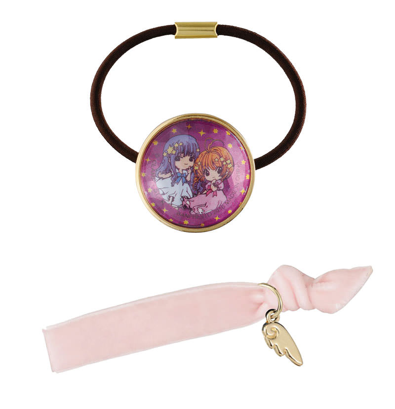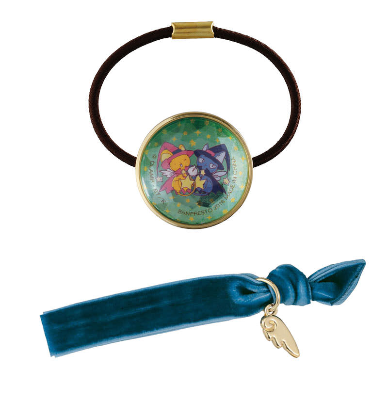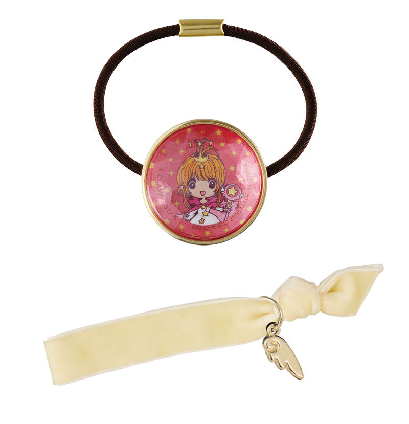 キャラクターのイラスト付きの鮮やかな宝石と羽のメタルチャームがセットのリボンゴムです。