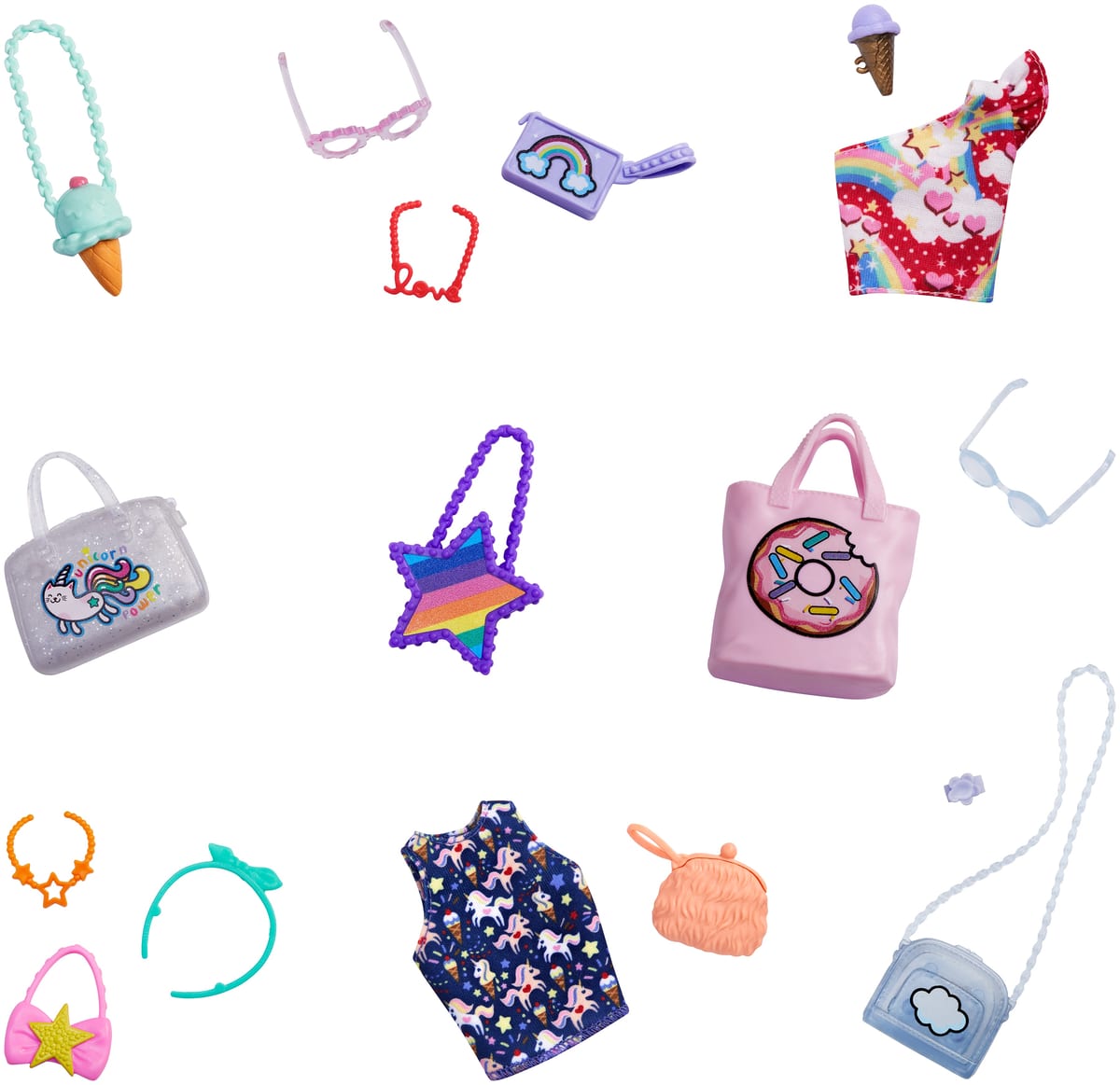 光沢のあるワンピースや透け感のあるトップス、小さい鞄など、最新のファッショントレンドを反映したアイテムが多数入っていて、自由に組み合わせながらドール遊びを楽しめます。
