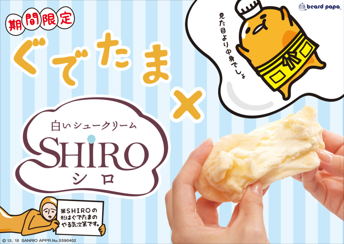 シュークリーム専門店ビアードパパから、サンリオの人気キャラクター「ぐでたま」と白いシュークリーム「SHIRO」(シロ)とのコラボデザインパッケージ商品が登場!
