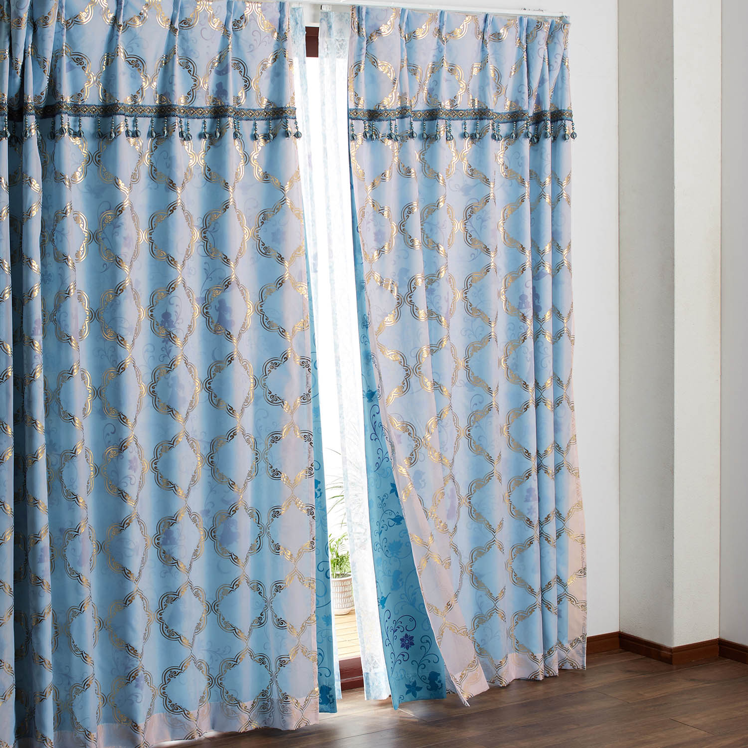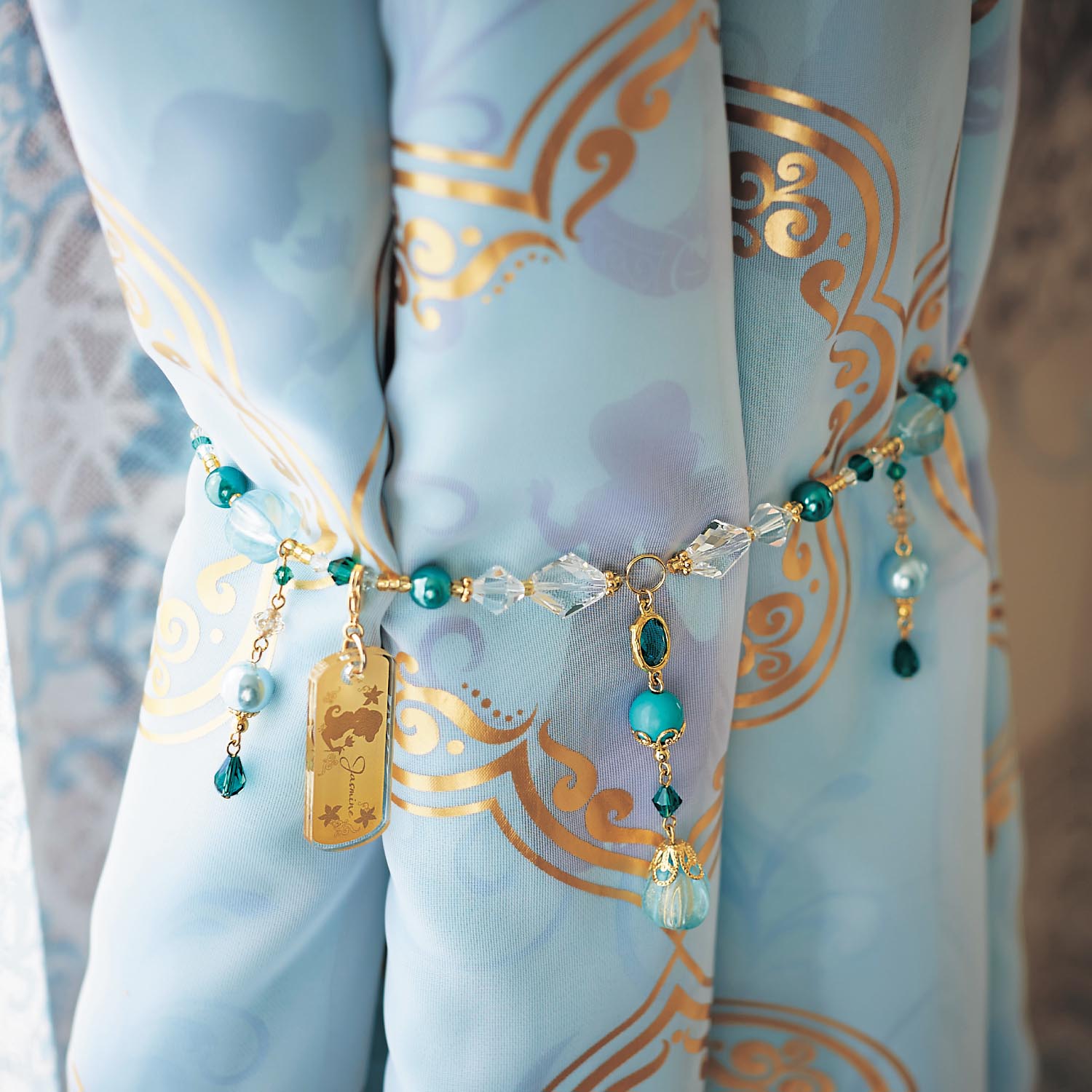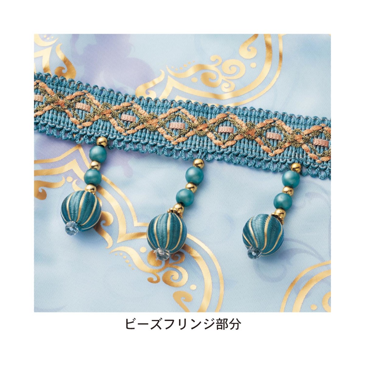 『アラジン』のディズニープリンセス「ジャスミン」のシルエットが施されたブルーの遮光カーテンとビーズフリンジが印象的な箔プリントトップボイルの2重カーテン☆