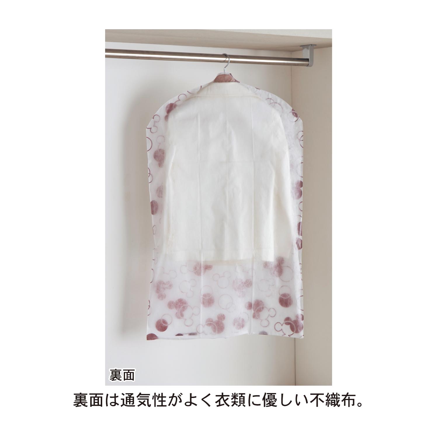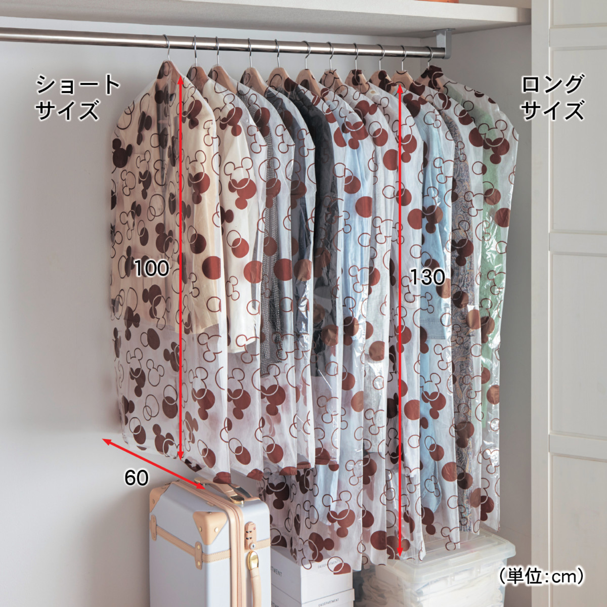 大事な衣類をホコリやひっかけによるホツレなどから守り、ミッキーモチーフがデザインされた表面は透明フィルムなので中身がひと目でわかります。