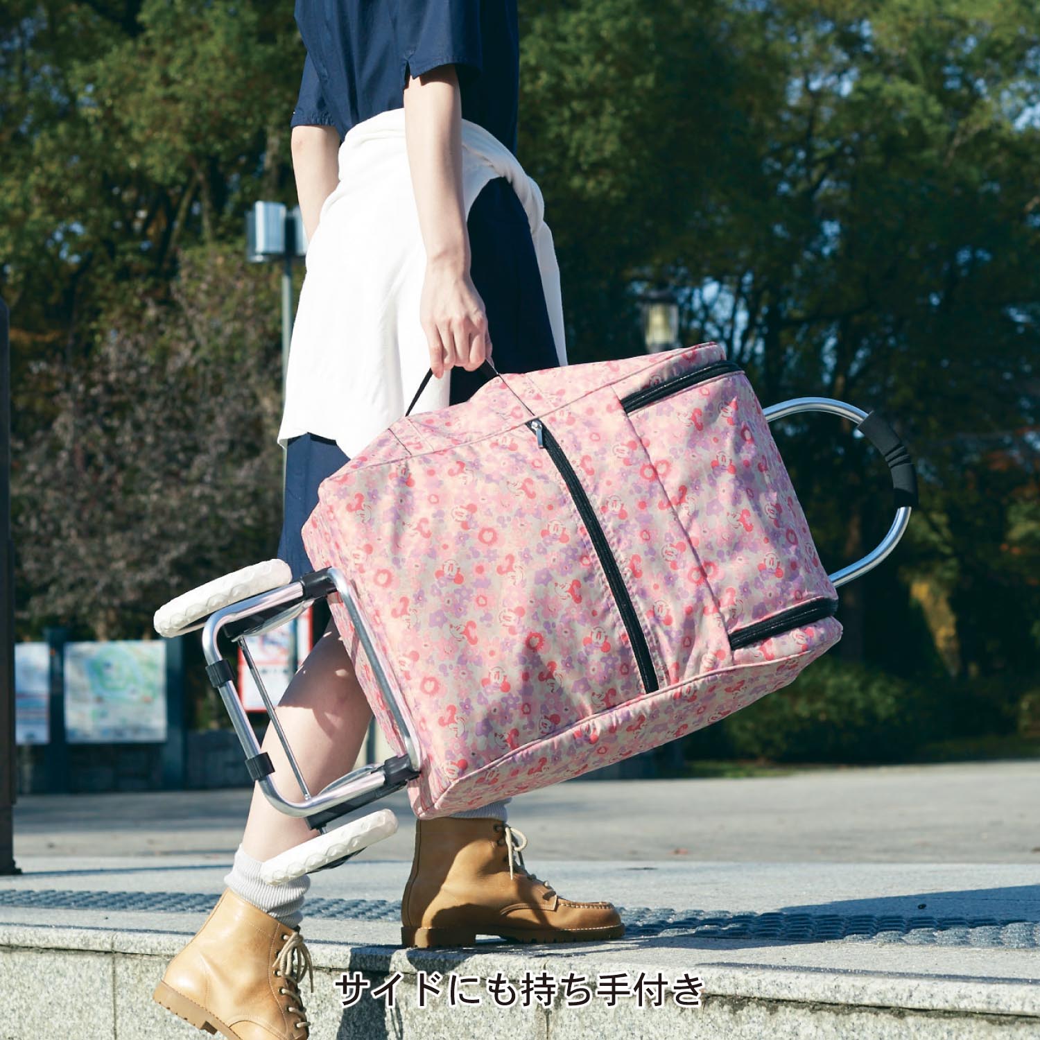 サイドにも持ち手が付いているので、カートを引けない場所では横持ちも。