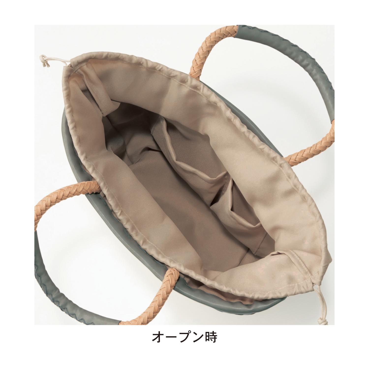持ち手とバッグの上部にはグリーンの合皮素材が使われています。