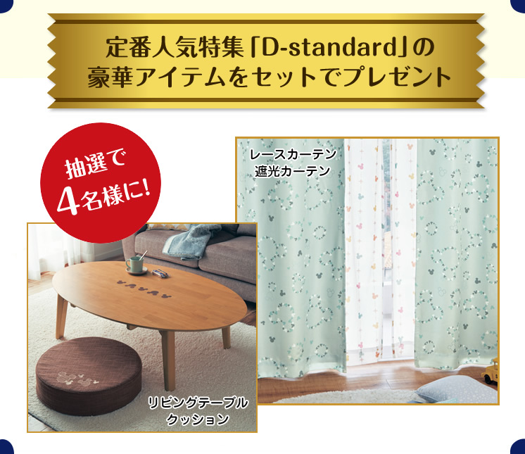 第2弾は、2018年3月1日(木)~4月30日(月)23:59までの期間、定番人気特集「D-standard」の豪華アイテム、リビングテーブル、クッション、レースカーテン、遮光カーテンをセットにして抽選で4名にプレゼント!