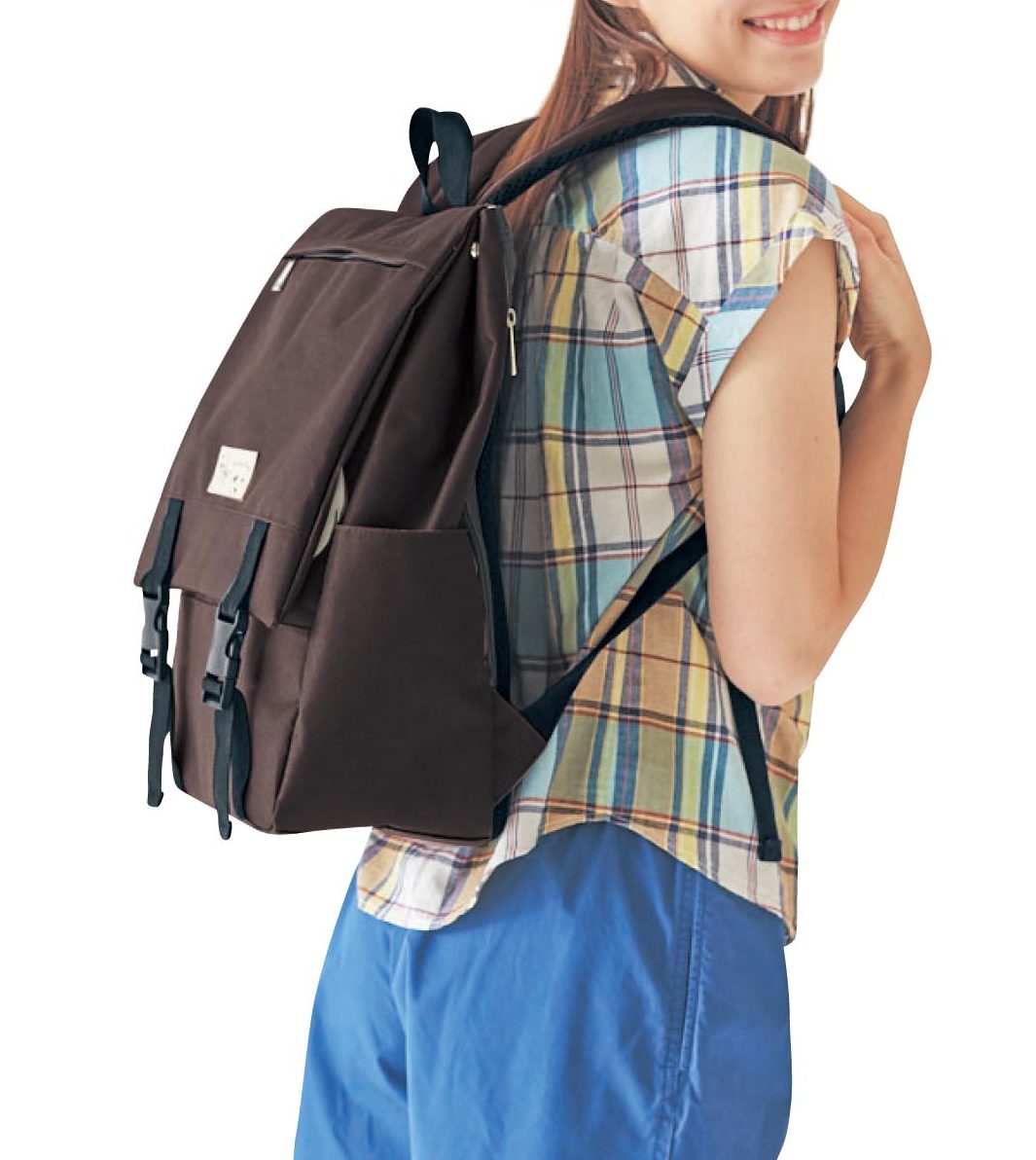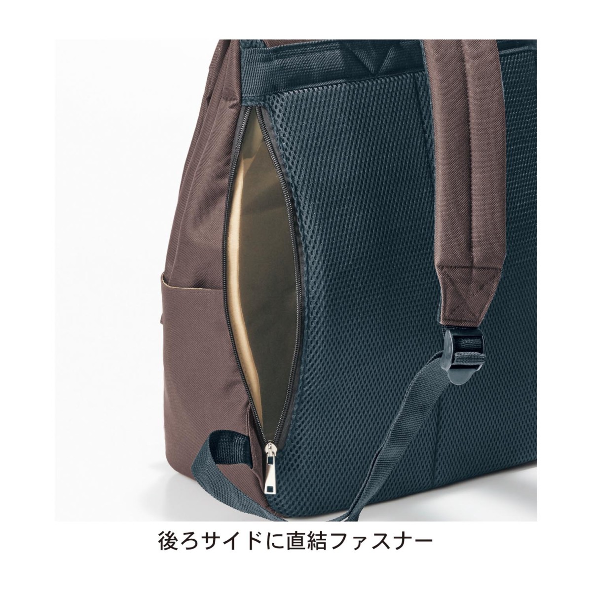 フラップ部やサイドにポケットがあり、後ろのファスナーからも荷物の出し入れができるのが便利なポイント♪