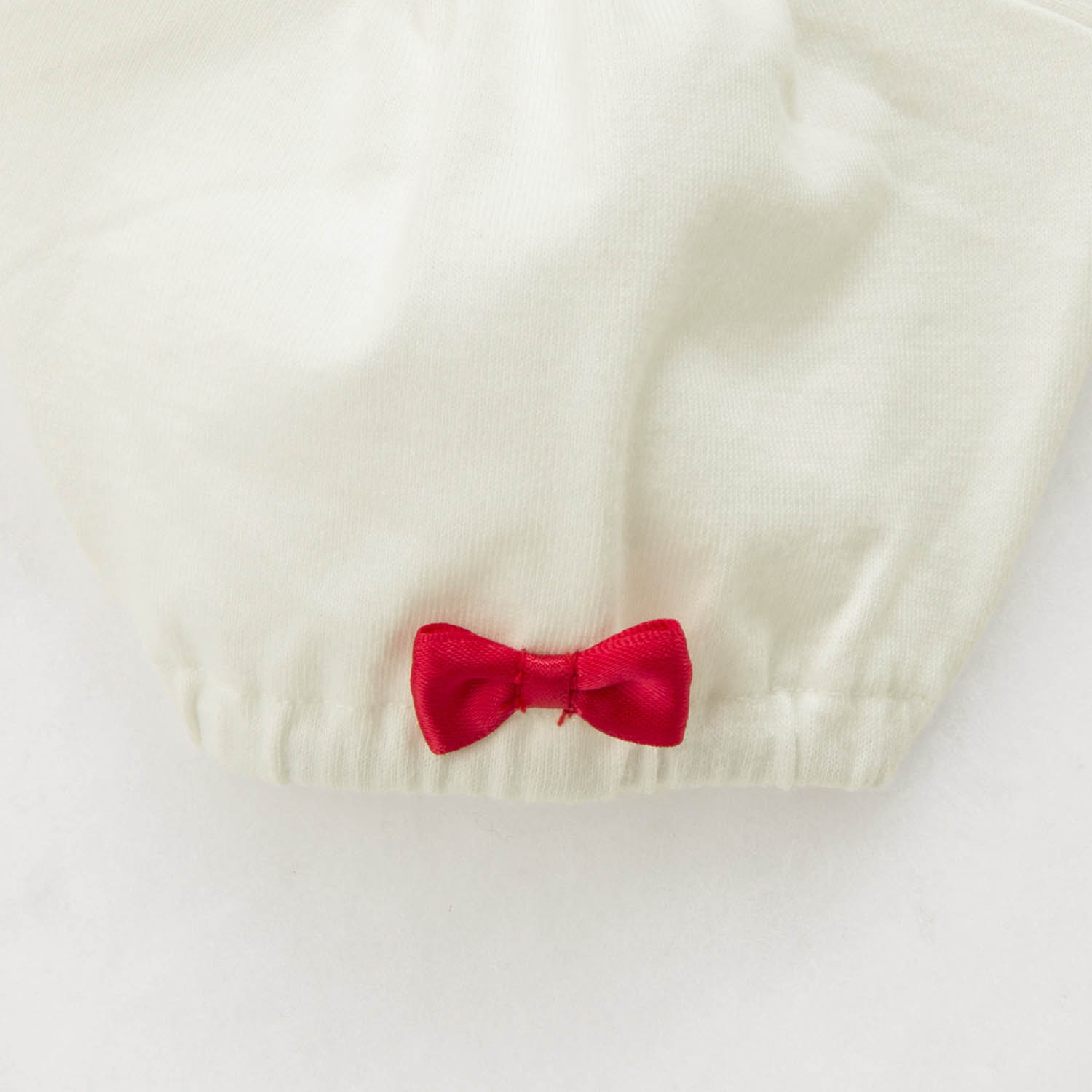 両袖にはそれぞれ、赤やパステルグリーンのコロンとしたリボンが施されています。