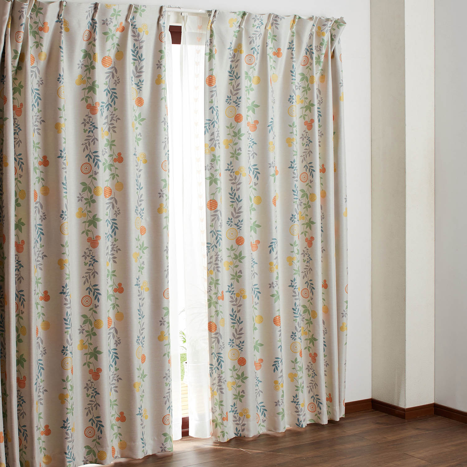 ナチュラルな植物やフルーツ柄の中にミッキーモチーフが隠れている楽しいデザインの遮熱・遮光カーテン☆