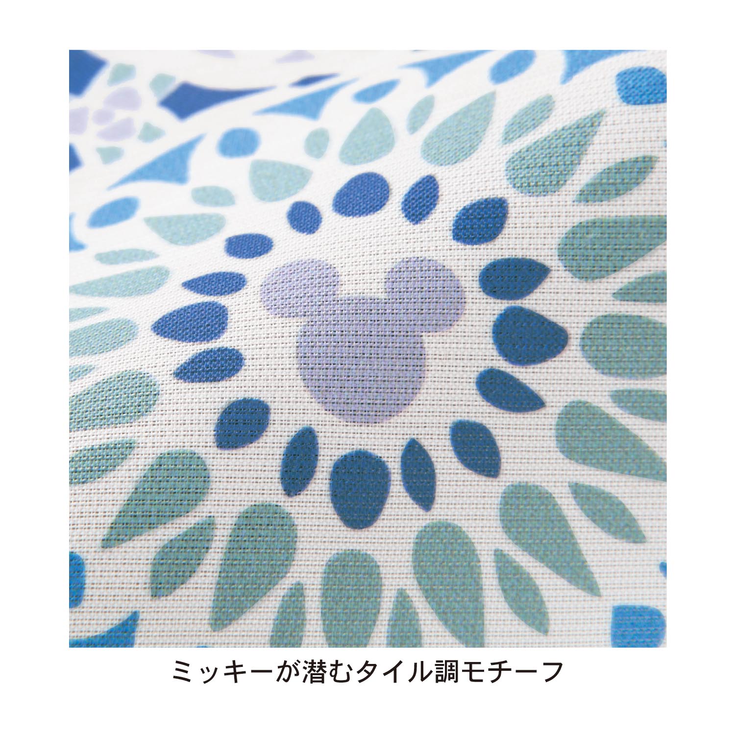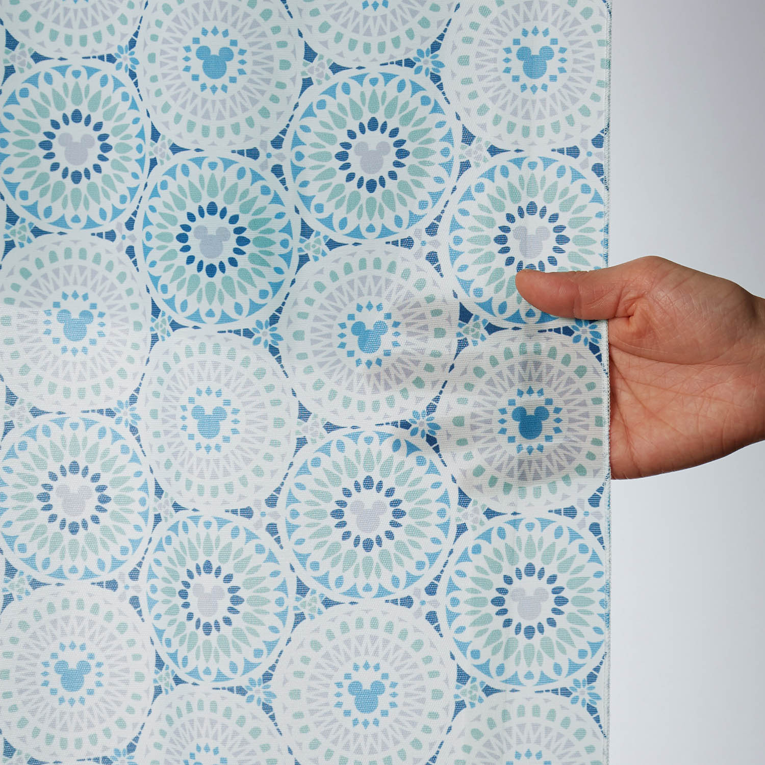 ミッキーモチーフがあしらわれたタイル調モチーフがカーテン一面にデザインされています。