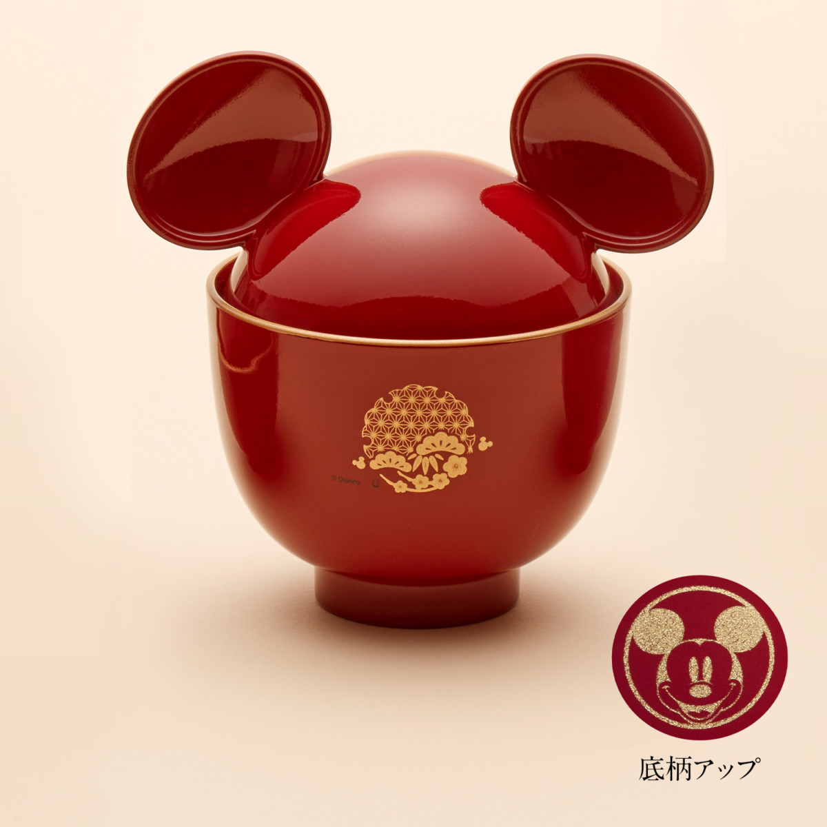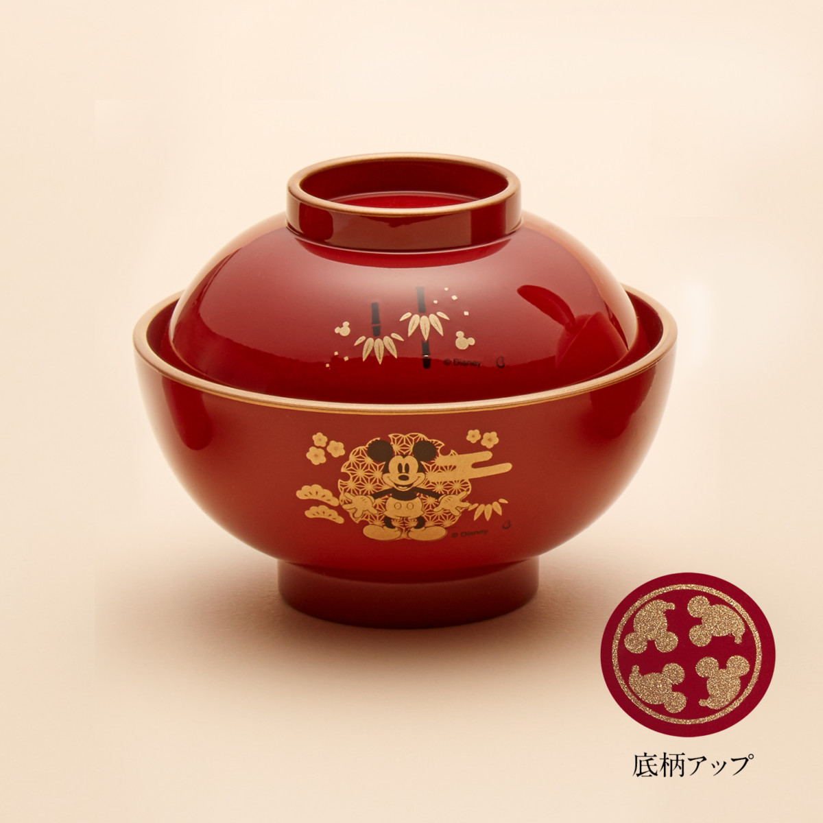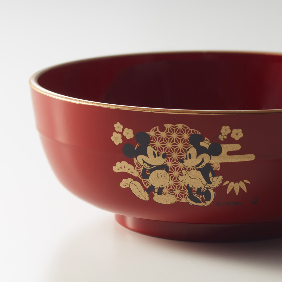 それぞれのうつわには、朱塗りに金縁仕上げの合成漆器に「ミッキー&ミニー」と松竹梅があしらわれています。