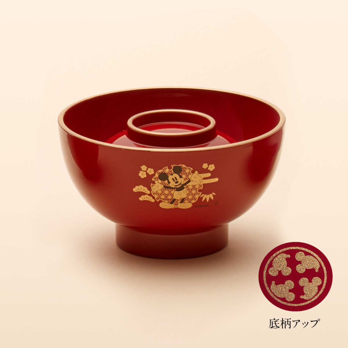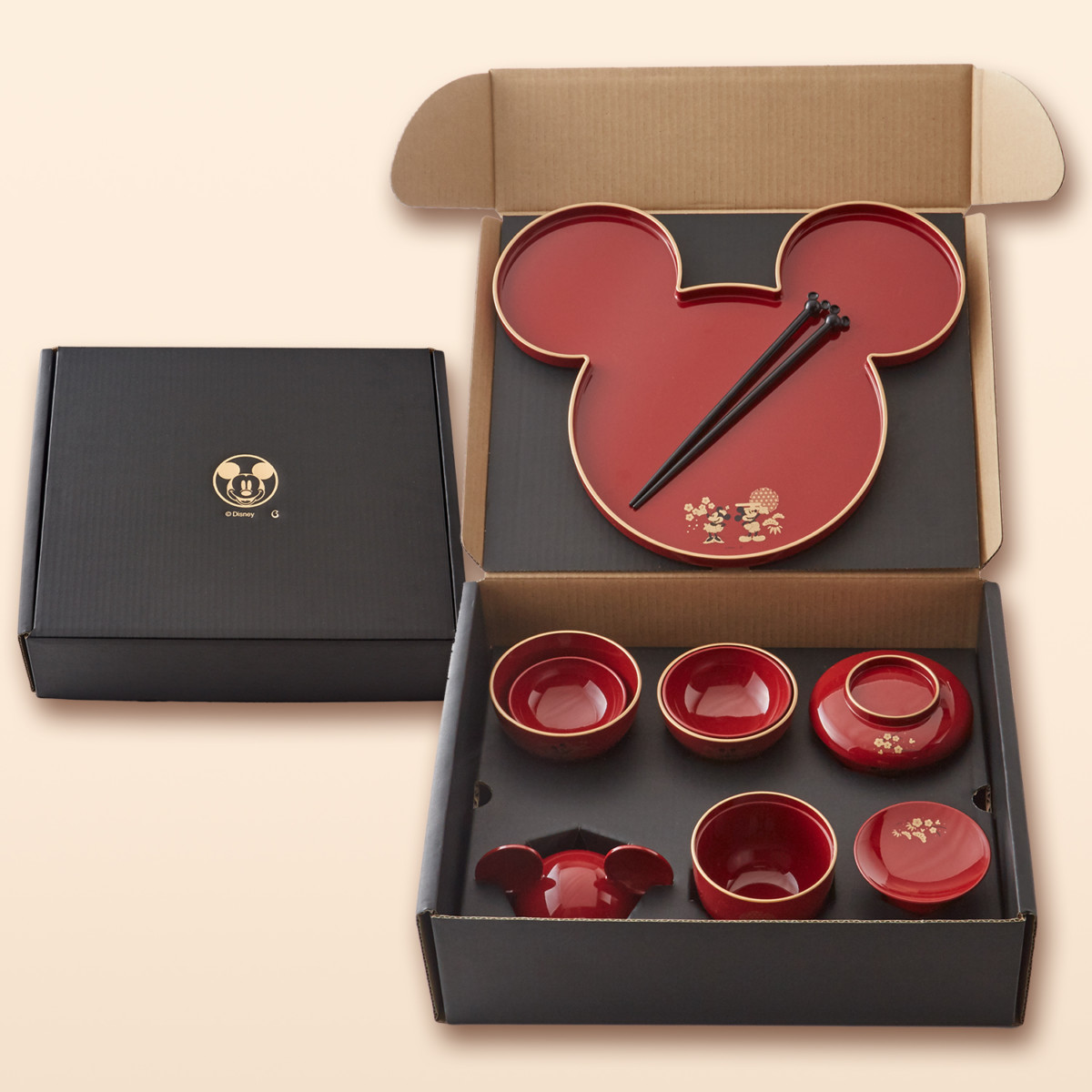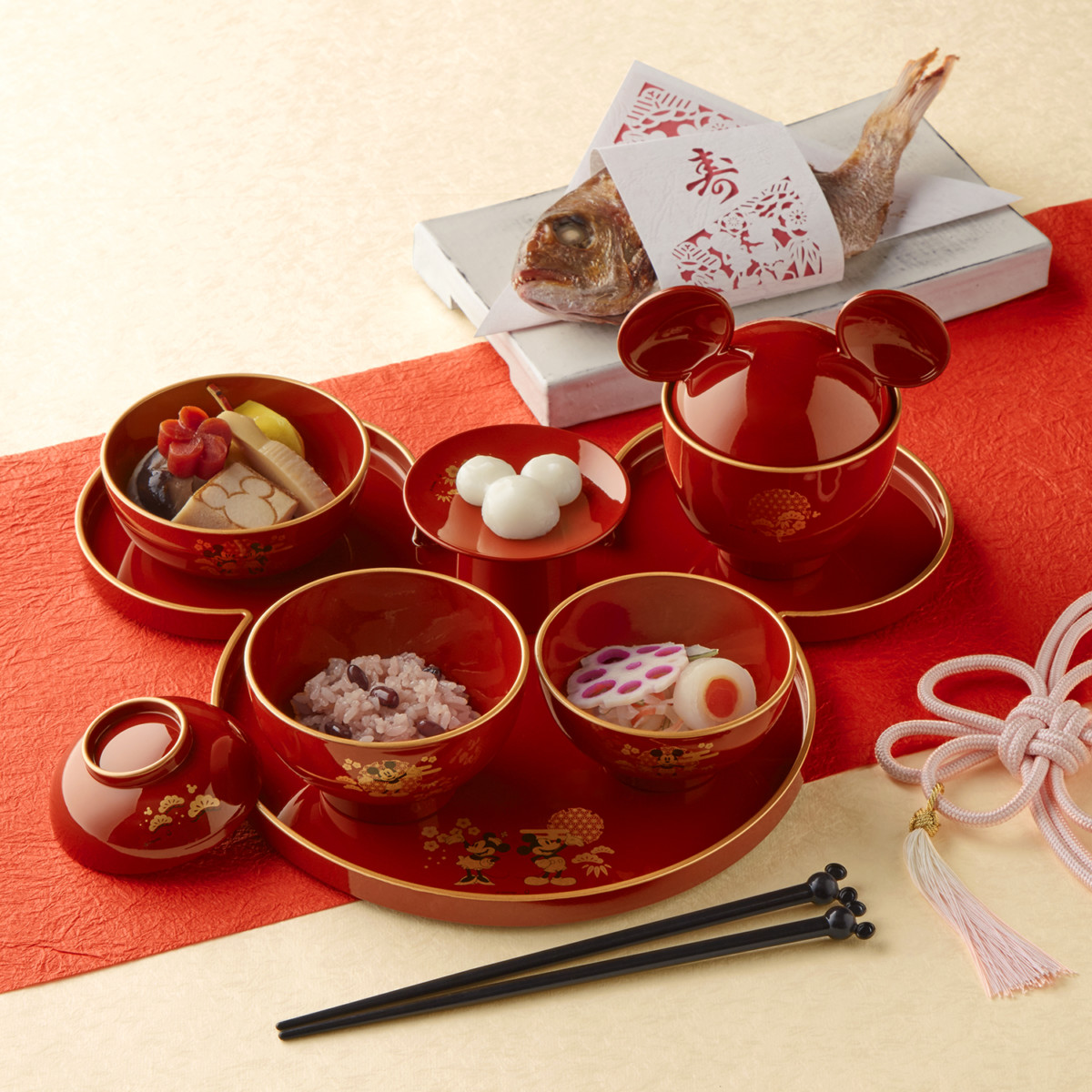それぞれのうつわには、朱塗りに金縁仕上げの合成漆器に「ミッキー&ミニー」と松竹梅があしらわれています。