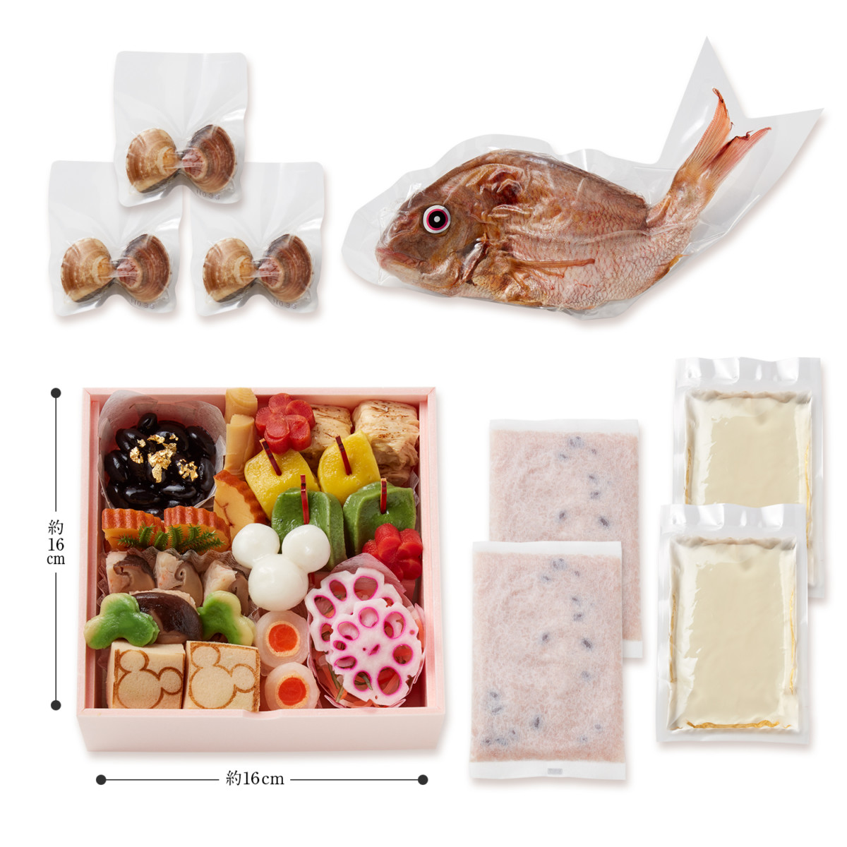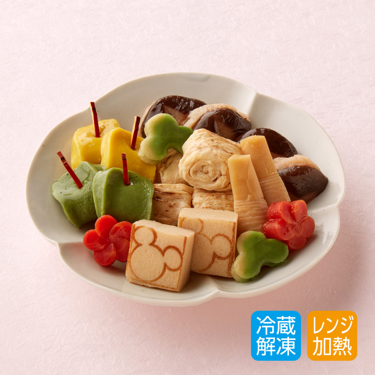 ミッキー型焼印の高野豆腐や、椎茸のかさに色鮮やかな海老入りのすり身を合わせたえび陣笠、など縁起食材を厳選しています。