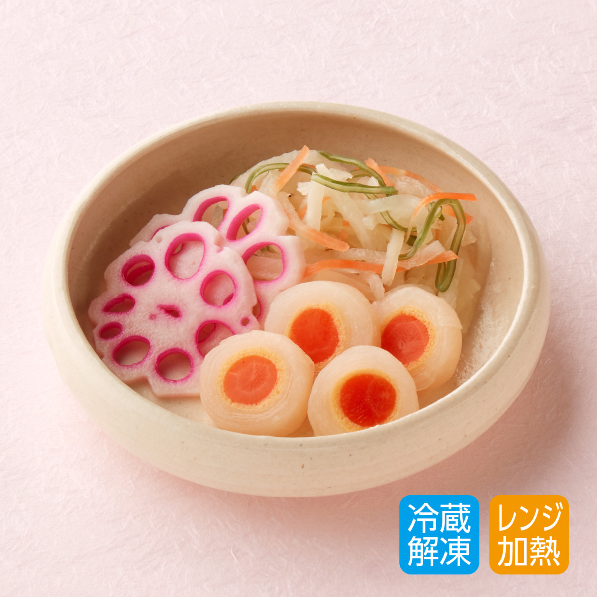梅の花に見立てたれんこん、日の出に見立てた砧(きぬた)巻き、宮崎県産の大根を甘酸っぱい味付で。
