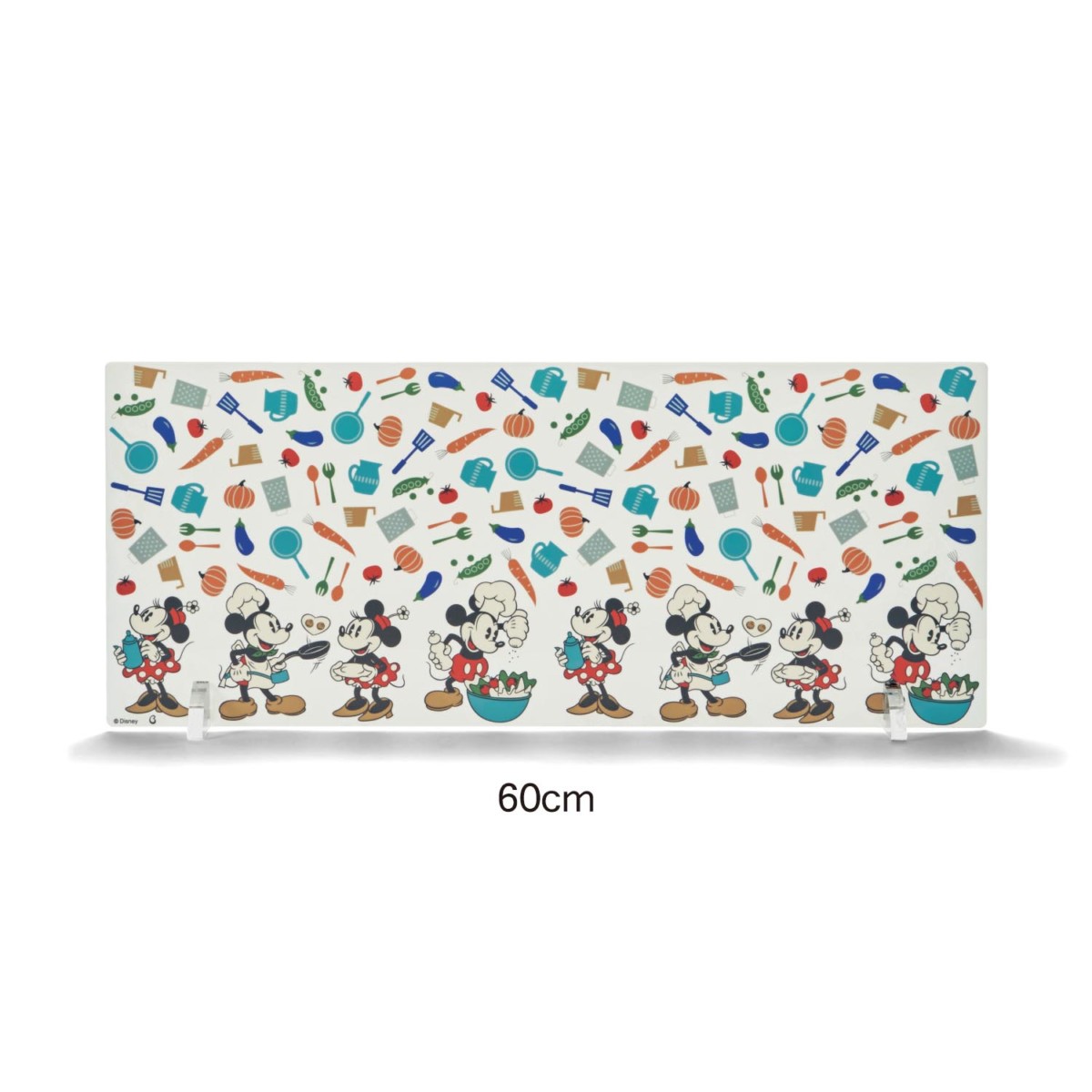 どちらのサイズも、上部にはカラフルな野菜やキッチン雑貨のモチーフに、下部には「ミッキー」と「ミニー」が楽しそうにお料理をしている様子がデザインされています。