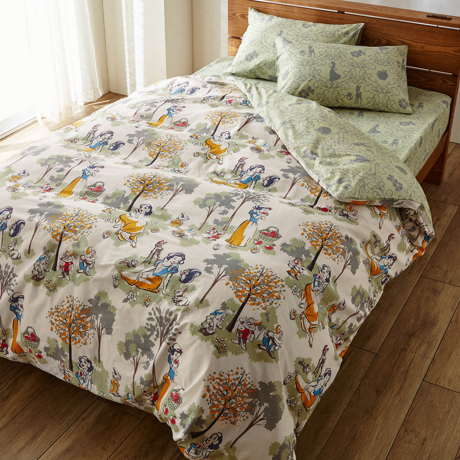 掛け布団カバーの表面には、「白雪姫」が森の中で七人のこびとや動物たちと楽しそうに過ごすシーンが落ち着いた手描きタッチで描かれています。