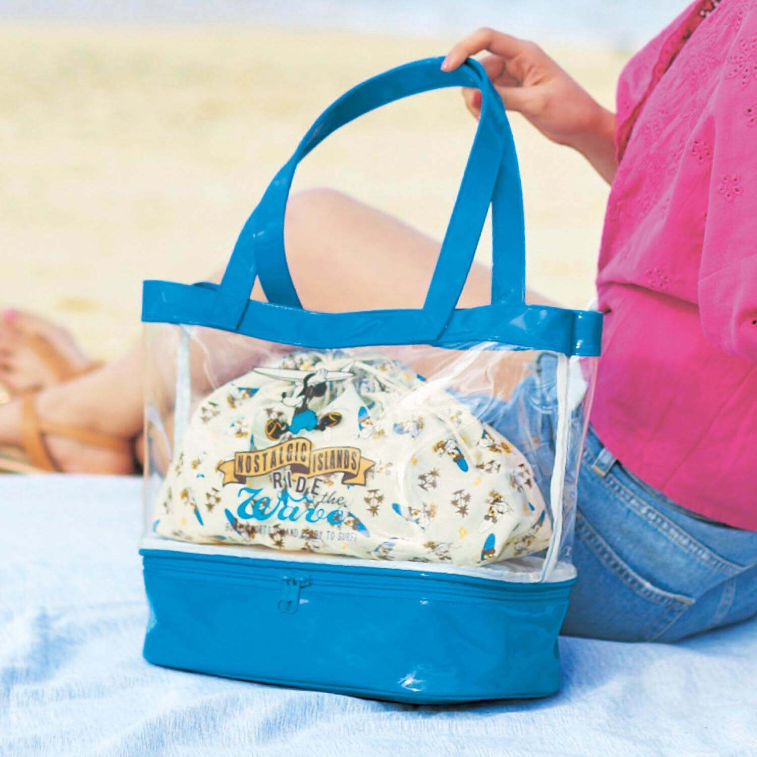 ビニールバッグは2段式で、下段に濡れた水着や砂のついたサンダルを入れるなど使い分けができます♪