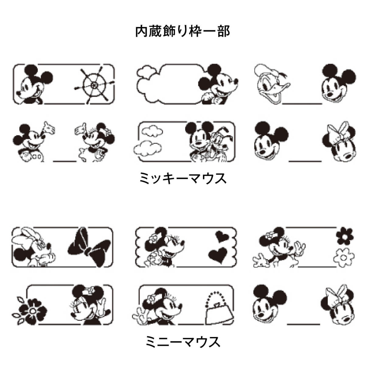 ミッキー&ミニー柄のラベルテープ1本と黒文字白テープ1本付き。