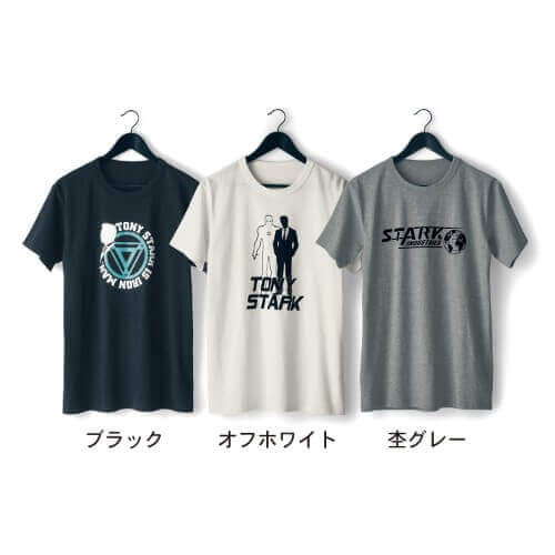 彼が運営する巨大軍事企業「スターク・インダストリーズ」社のエンブレムや「トニー・スターク」のシルエットなどが施されたTシャツ3種が登場します!