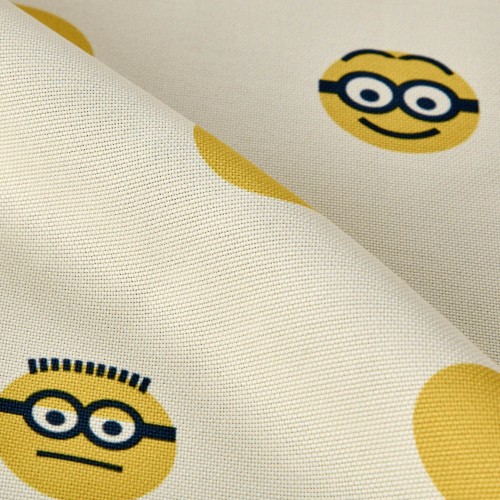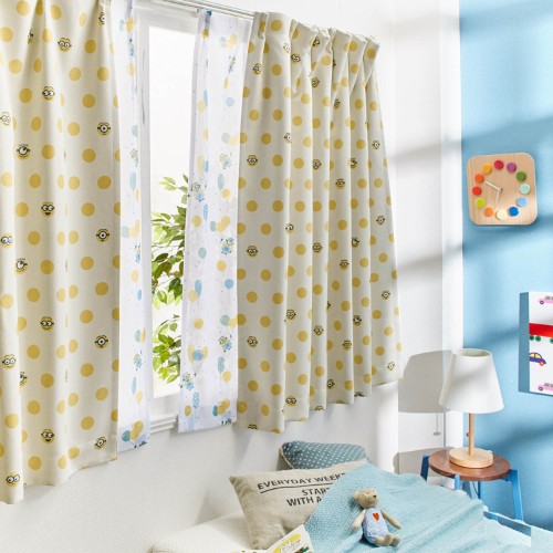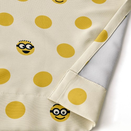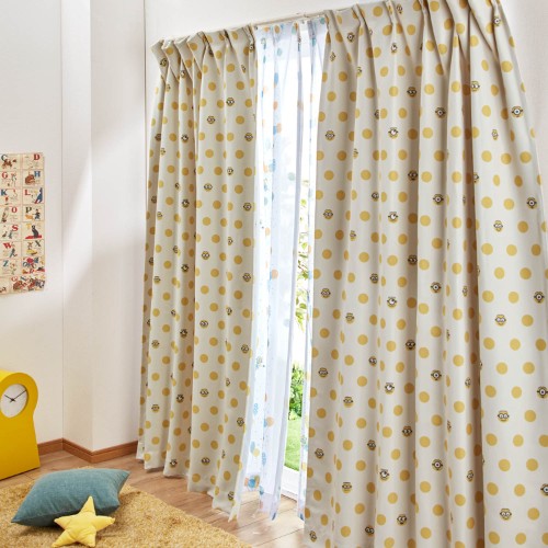 パステルイエローをベースにした厚手カーテンには、可愛い「ミニオン」たちのお顔がプリントされています。