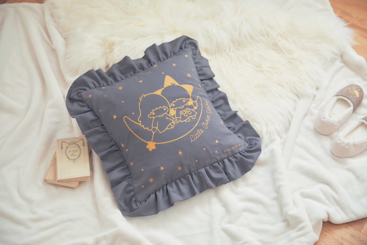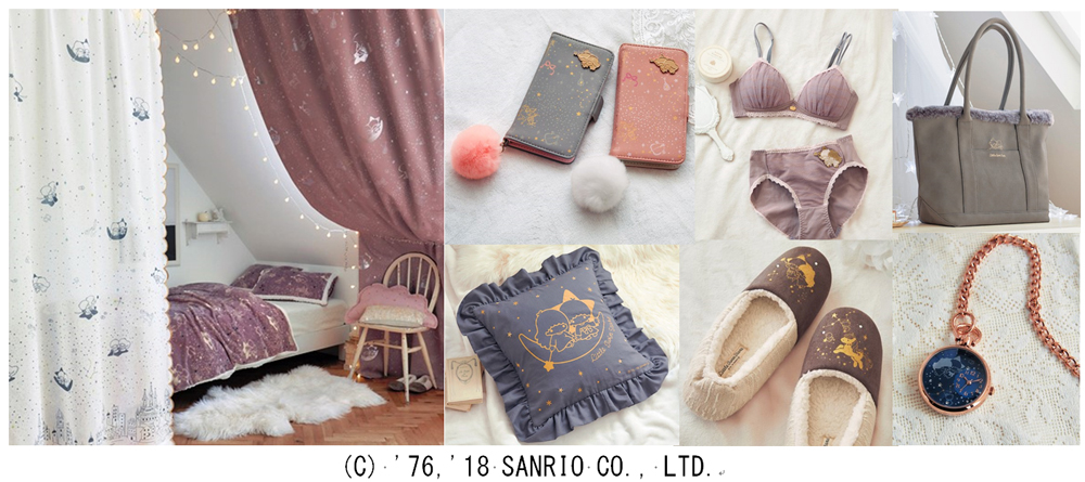 『Little Twin Stars/Deuxetoile』シリーズは、寝具やカーテン、クッションやスリッパなど部屋を彩るインテリアから、インナーやパジャマ等のルームウエアのほか、バッグや時計などファッショングッズにさりげなくキキ&ララがいるのが特長。
