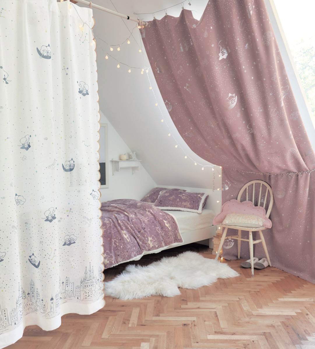 シックなローズ色に白やシルバーの箔プリントでキキ&ララをあしらった遮光機能付きカーテン。