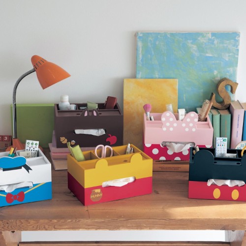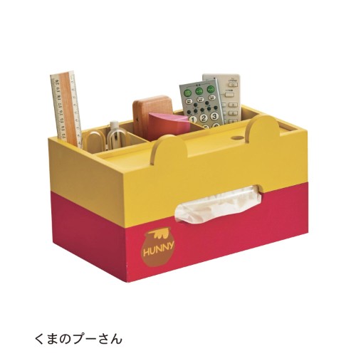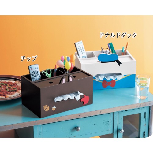 ディズニーデザインの「卓上小物収納ボックス」は、ティッシュボックスと一緒に、机で散らかりがちなリモコンやメガネ、ペンなどの文房具類も収納できて便利です。