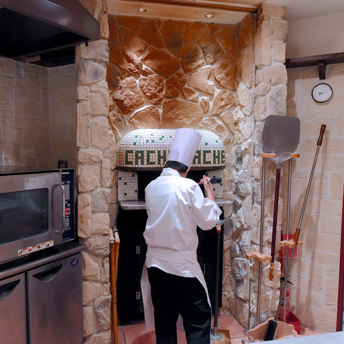 カシュカシュ名物のピザ窯で焼き上げる「窯焼き マッシュルームのタルトフランベ」