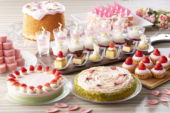 桜の花びらのような薄いピンクのスイーツと、まだまだシーズンのいちごを使ったスイーツがたっぷり!