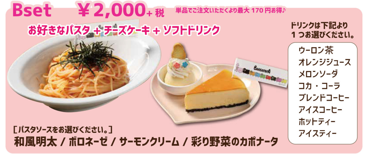 Bセットは、お好きなパスタ+チーズケーキ+ソフトドリンクのセットです☆