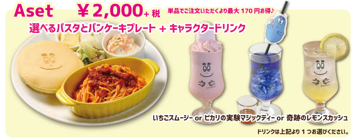 Aセットは、選べるハーフパスタとパンケーキプレート+キャラクタードリンク(いちごスムージー・ピカリの実験マジックティー・奇跡のレモンスカッシュより1杯)のセット。