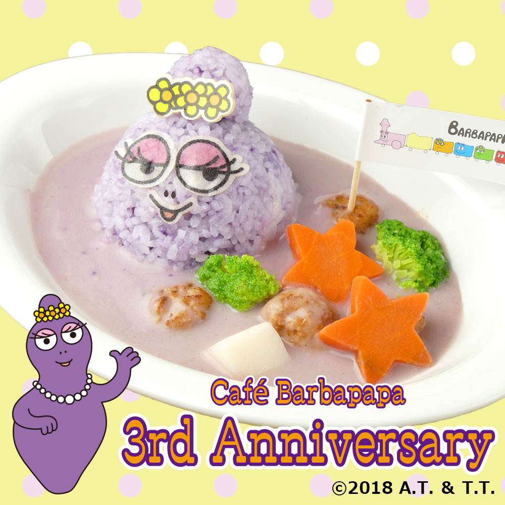 2018年11月10日(土)から12月31日(月)まで、越谷レイクタウン店のオープン3周年を記念して、バーバパパファミリーのおませな女の子「バーバベル」のパープルカレーとコットンキャンディソーダの2種類が登場します!