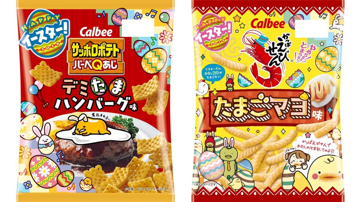 カルビーより、イースターに関連した商品としてサンリオの人気キャラクター「ぐでたま」とコラボした「サッポロポテト バーべQあじ デミたまハンバーグ味」(写真左)が登場!