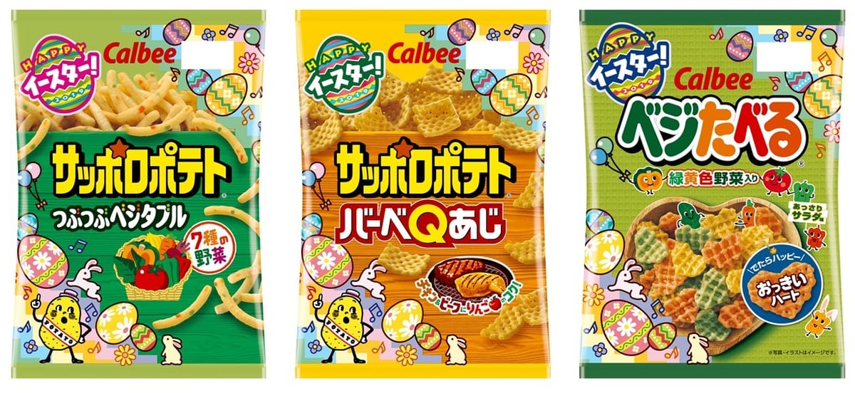 「サッポロポテト つぶつぶベジタブル」「サッポロポテト バーべQあじ」「ベジたべる あっさりサラダ味」が、卵やうさぎのイラストをちりばめた可愛いパッケージとして登場。