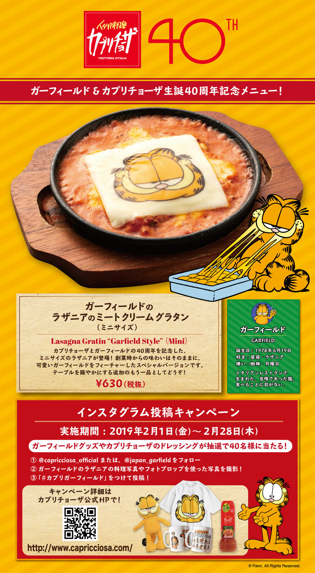カジュアルイタリアンレストラン「カプリチョーザ」から、大人気の猫キャラクター「ガーフィールド」とコラボレーションしたスペシャルメニューが登場!